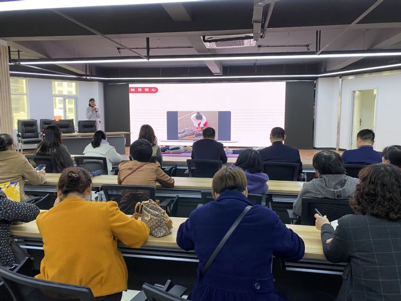 志愿者为在场社区居民、青年职工详细讲解心肺复苏术和海姆立克急救法的实施步骤,使在场社区居民和青年职工在愉快活跃的气氛中切身体会并掌握急救知识。