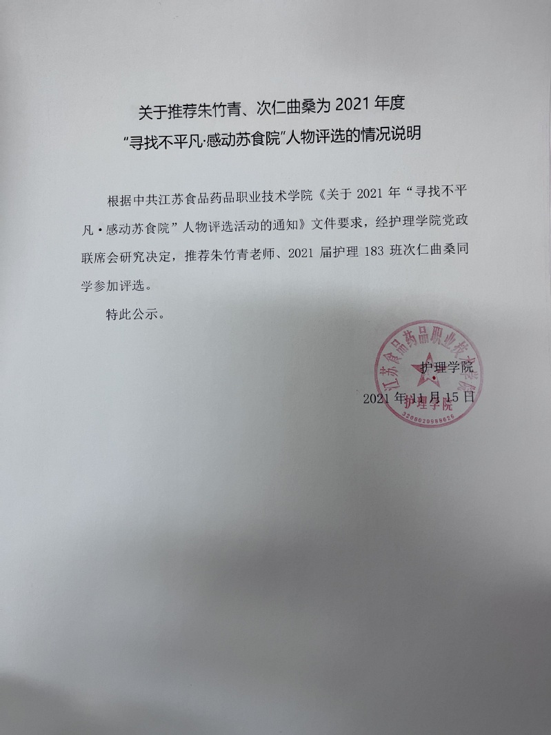 关于推荐朱竹青、次仁曲桑为2021年度“寻找不平凡 感动苏食院”人物评选的情况说明