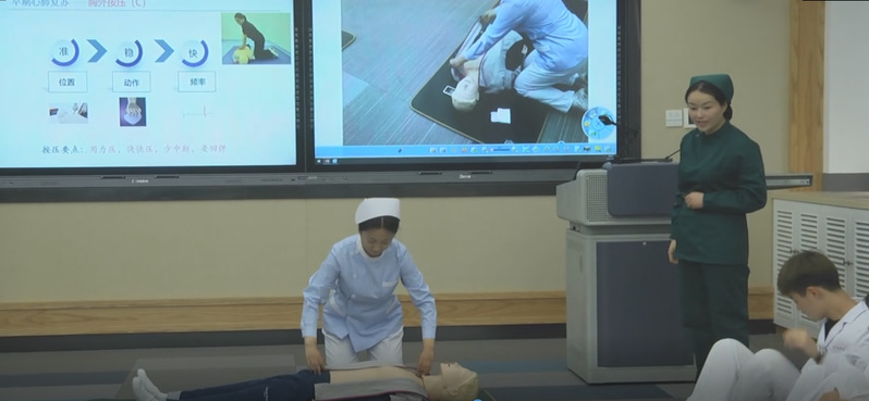 此次课以“心肺复苏术”项目为主线,在课前、课中、课后3个阶段中,通过试、探、展、练、评、拓六个环节,做到教学内容和工作内容,教学标准和职业标准,课程思政和技能提升,课程教学和信息技术的“四融合”。