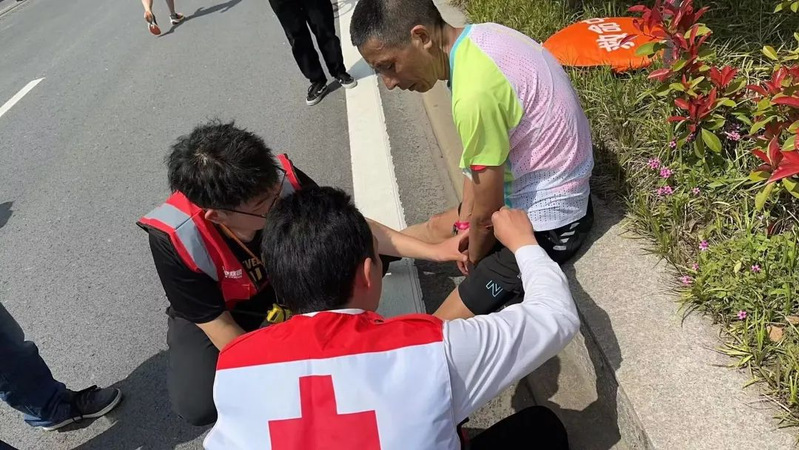 枪声响起的那一刻,选手们冲开起点线的同时,志愿者们已在岗位上严阵以待。一位选手在跑到29公里站点处突发意外。严阵以待在跑道旁的志愿者盖国帅快速赶到选手身边,为他进行按摩放松。在志愿者的帮助下,选手很快恢复了状态,继续跑向远方。其他赛段也有一些运动员有不同程度的擦伤、扭伤,在志愿者们的悉心处理下,伤情都得到了好转。