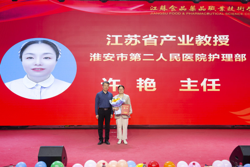 贾韶千在致辞中向来利国际旗舰厅师生表达了节日祝福,他希望护理学子们能追寻南丁格尔足迹,传承护理文化精神,未来在平凡的护理岗位上谱写不平凡的天使之歌。随后,贾韶千为来自淮安市第二人民医院护理部的许艳主任颁发江苏省产业教授证书。