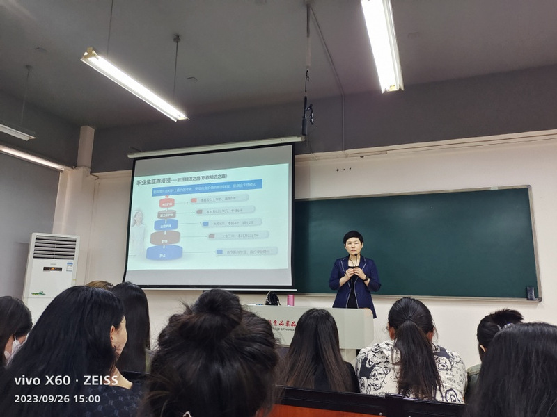接着,王慧分享了护理职业规划,帮助将要迈入实习岗位的同学们树立正确的自我价值,就同学们如何设置自己的职业规划、目标怎样来实现等方面进行了系统地阐述。她通过新冠肺炎医护人员奋勇抗疫的事例引发员工对护理职业的思考,让同学们深刻体会到护理是一份辛苦却十分神圣的职业。最后,王慧寄语同学们要弘扬南丁格尔精神和新时代青年人的奋斗精神,成长为有理想、能吃苦、肯奋斗的优秀护理人员。
