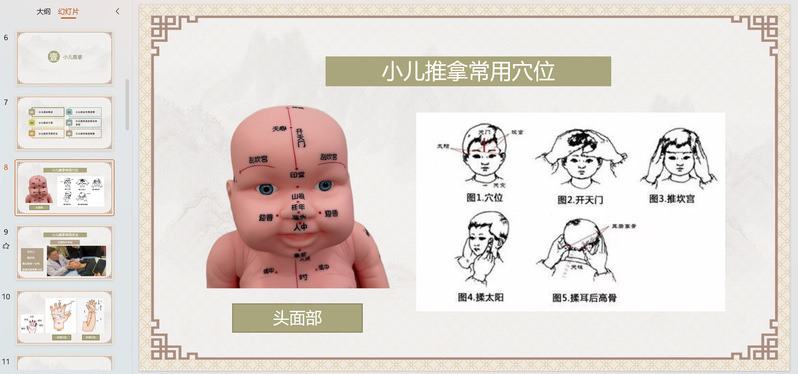 周倩倩老师先介绍了学习的课程内容包括小儿推拿、穴位敷贴、灸技刮痧、火罐等方面。接着以小儿推拿为例,对小儿推拿的内容进行仔细介绍,包括:小儿推拿的作用原理,小儿推拿的介质选用、小儿推拿适应症及其禁忌症,以图片及视频的形式展示小儿推拿的常用手法,对于儿童常见病的重点手法的展示如小儿感冒及鼻炎的推拿调理、小儿便秘的推拿调理、小儿消化不良的推拿调理及小儿遗尿的推拿方法。