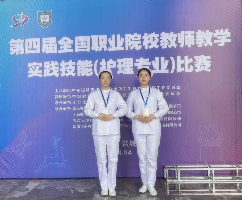 本赛项为团队赛,每支团队2名队员,竞赛内容包括“理论竞赛”、“说课程竞赛”和“技能竞赛”,参赛教师均需完成三个部分竞赛内容。全面考核师生护理专业理论知识和操作技能水平以及人文关怀素质,检验教学成果。比赛前,两位老师利用课余时间在护理实训室进行技能训练,经过几个月积极刻苦的备赛,两位老师在赛中操作娴熟精准,动作流畅到位,表现出了扎实的基本功,体现出强烈的进取精神和团队合作意识,赛出了风格、赛出了水平,展示了护理专任教师良好的精神风貌和良好的护理专业水平。