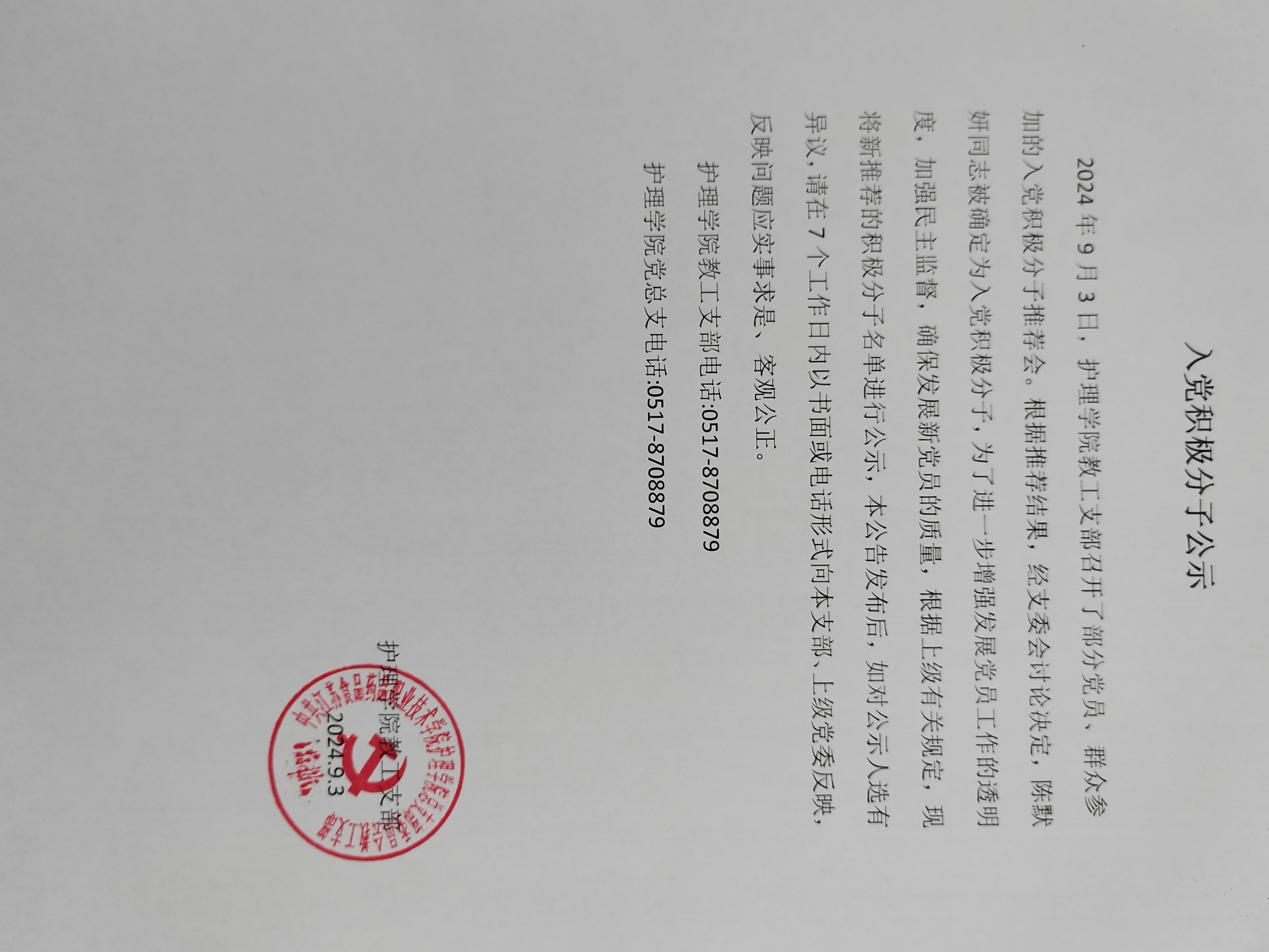 2024年9月3日,来利国际旗舰厅教工支部召开了部分党员、群众参加的入党积极分子推荐会。根据推荐结果,经支委会讨论决定,陈默妍同志被确定为入党积极分子,为了进一步增强发展党员工作的透明度,加强民主监督,确保发展新党员的质量,根据上级有关规定,现将新推荐的积极分子名单进行公示,本公告发布后,如对公示人选有异议,请在7个工作日内以书面或电话形式向本支部、上级党委反映,反映问题应实事求是、客观公正。