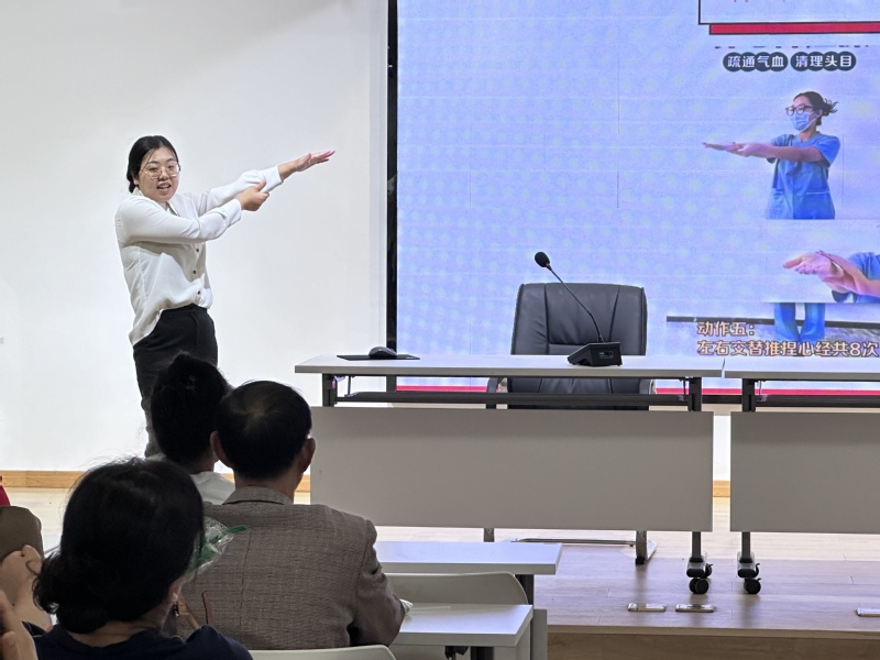 王老师介绍了如何正确监测血压,包括测量前的准备工作以及测量时的注意事项,并现场发放了简单易用的血压记录表格,鼓励大家做好日常监测与记录。同时还强调低盐低脂、多果蔬的饮食原则以及散步、太极等温和运动对血压控制的益处。王老师还带领老年人,一起学习“养心降压操”,伴随着轻柔的音乐,老年朋友们纷纷起身跟学,气氛热烈而温馨。最后,在“高血压之歌”的欢快旋律中圆满落下帷幕。