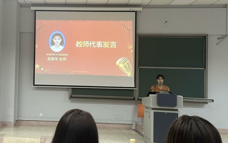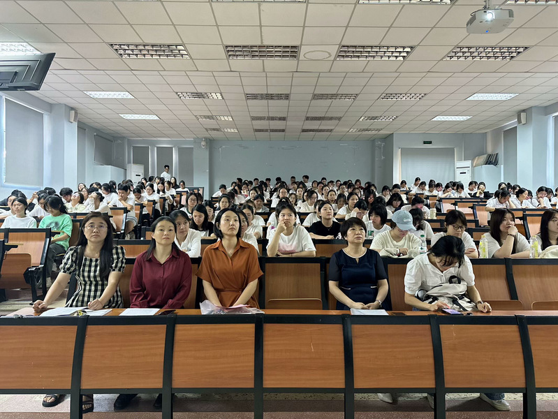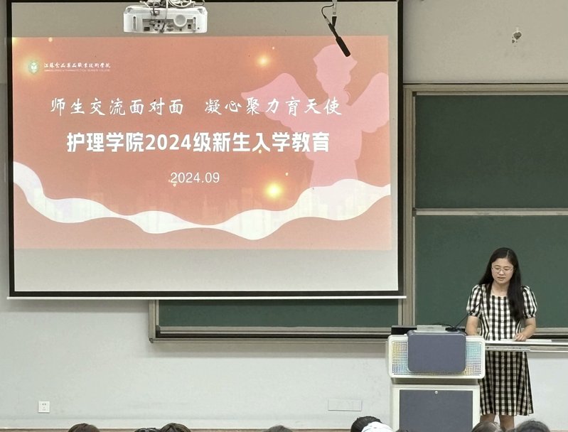 经理兼党总支书记戴翠萍、副经理朱竹青、副经理孙荣瑾出席会议、党总支副书记魏艳清主持会议,2024级全体新生及部分教师代表参加会议。