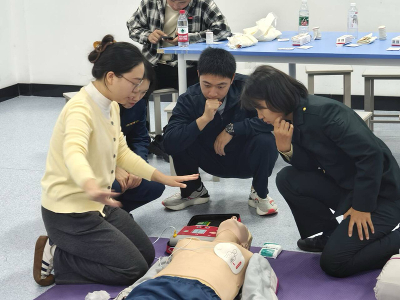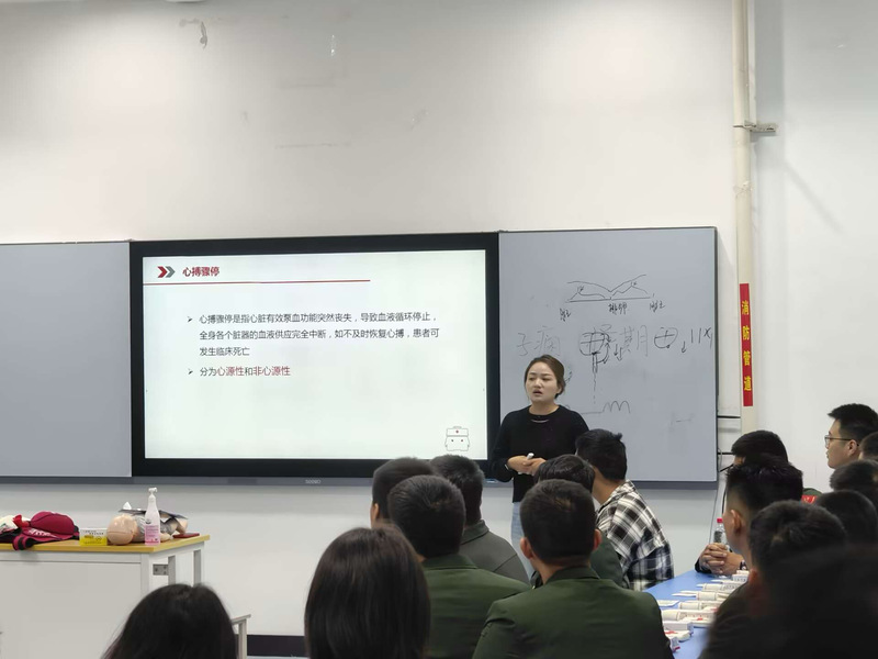 活动现场,主讲人王露老师和曾静老师采用理论和实际教学,利用PPT以生动的案例和通俗的语言,向大家讲解急救知识的重要性。理论结束后,王露老师使用“假人”向在场人员详细地演示和讲解,如何进行正确的心肺复苏、胸外按压、人工呼吸等步骤,曾静老师使用“假娃娃”教学海姆立克急救法、骨折固定以及止血包扎等方法,现场学习氛围高涨。