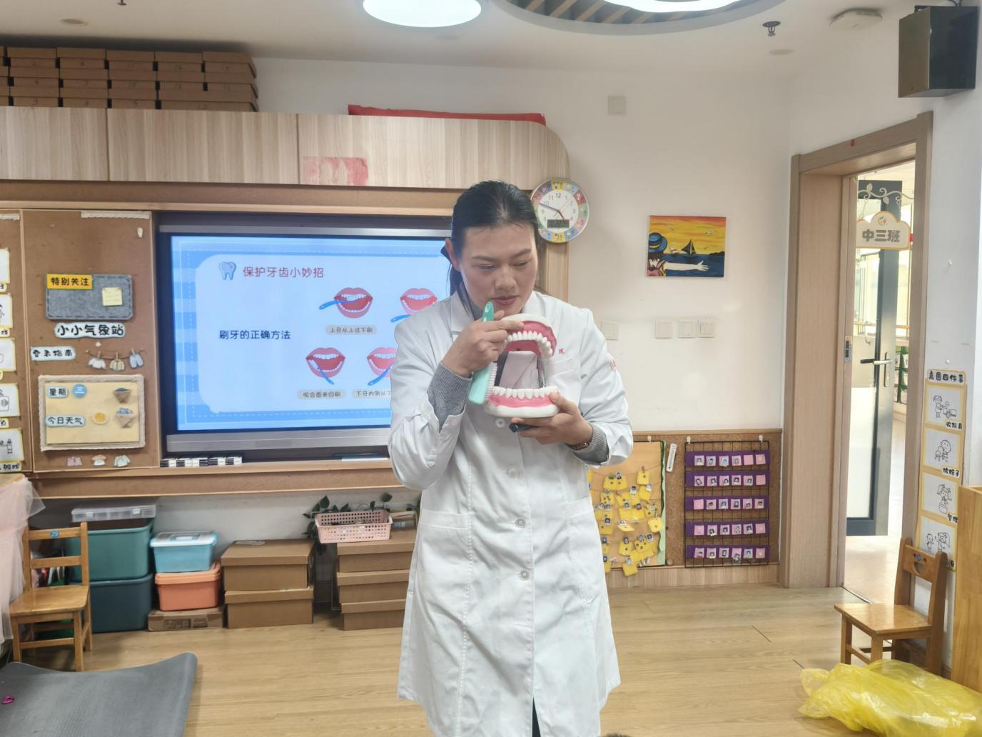 在实操教学中,师生们教小朋友们掌握科学刷牙方法:“上牙从上往下刷,下牙从下往上刷,咬合面来回刷,内侧也不忘”,搭配朗朗上口的 “刷牙歌”,让孩子们跟着节奏模仿练习,确保每次刷牙时长达到3分钟。同时设计 “护牙小闯关” 游戏,通过 “找出健康食物”“判断刷牙对错” 等环节,强化 “少吃甜食、少喝碳酸饮料,多吃粗粮蔬菜,饭后漱口、定期检查牙齿” 的健康理念,现场氛围热烈又温馨。