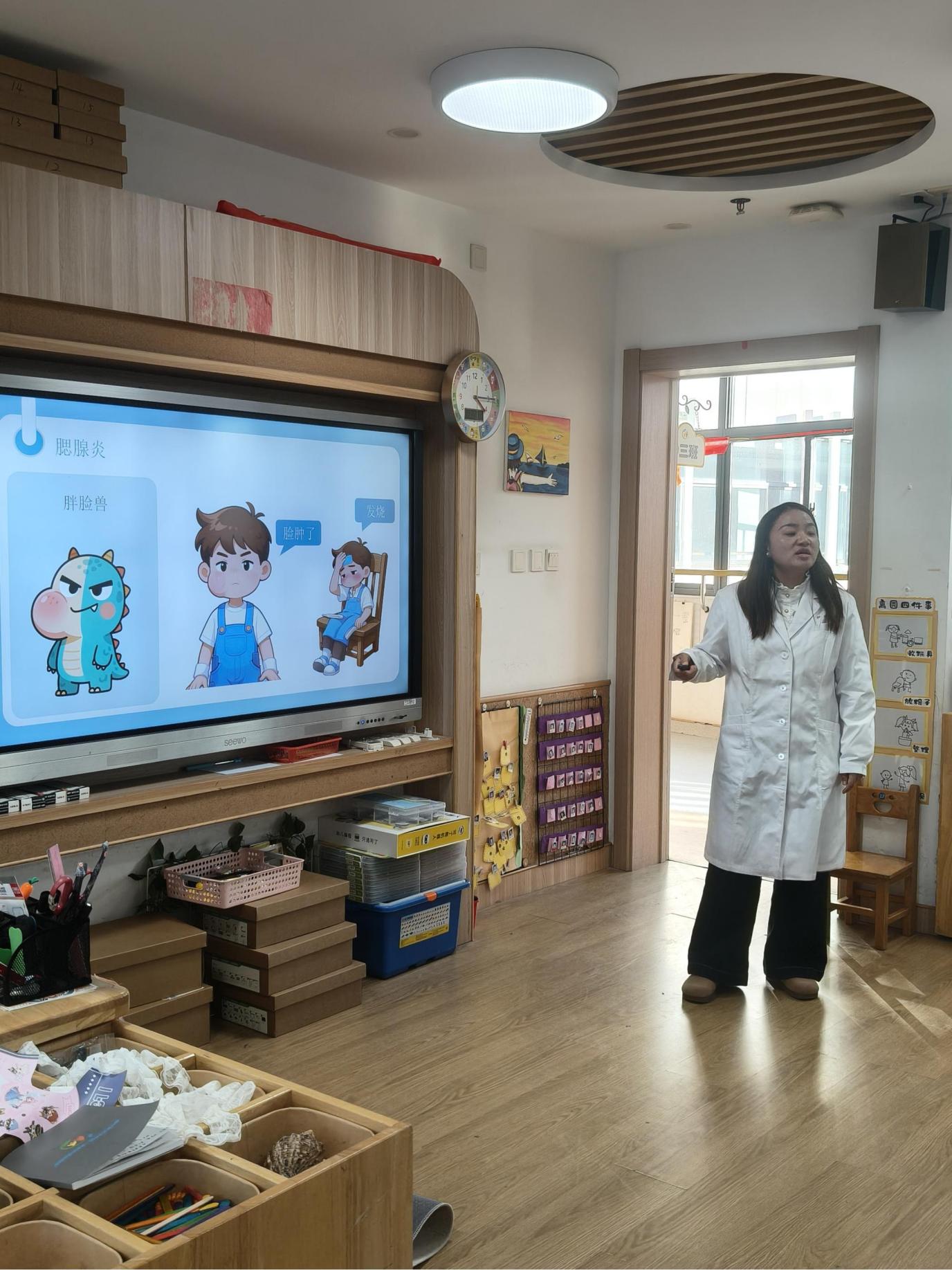 “秋冬天藏着许多看不见的‘病毒小怪兽’,它们会通过打喷嚏的‘飞沫小火车’、玩具上的‘病毒小乘客’悄悄传播哦!” 活动伊始,王露老师以童趣比喻引出主题,结合PPT中 “病毒小怪兽” 的科普内容,向小朋友们介绍了流感、诺如病毒、手足口病、水痘等秋冬常见传染病的症状 —— 比如流感的 “发烧咳嗽”、诺如病毒的 “呕吐腹泻”、手足口病的 “手脚口腔红点”。